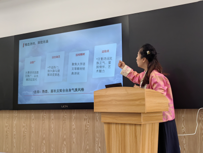 谈及备赛关键环节,刘婷婷老师将选题视为重中之重。她建议教师优先选择教材中彰显民族精神与家国情怀的经典篇目,并认为唯有对诗词饱含热爱,才能深入剖析其内涵,让讲解充满感染力。在教学设计层面,她以《饮酒》为例,分享以悬念式开头吸引评委关注的技巧,倡导突破传统逐句翻译模式,从意象解析、历史背景或现代价值关联等角度创新讲解视角,让经典诗词焕发时代光彩。同时,她还提到了课件应制作精美且突出重点,并建议根据诗词风格搭配服饰,以细节展现专业态度。