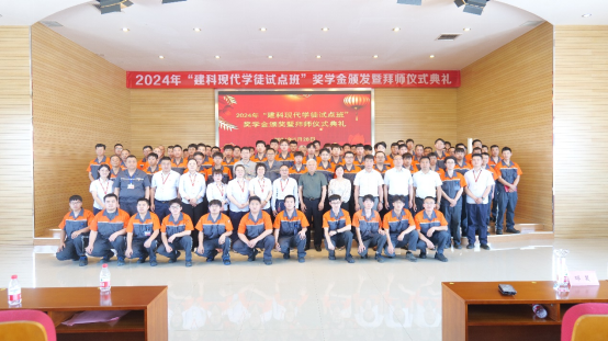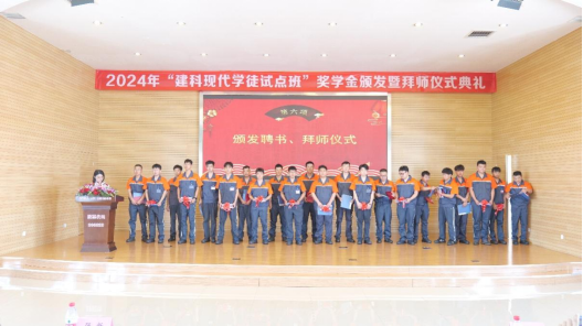 2024年5月28日上午9点,学院机械工程系第五批“建科现代学徒制试点班”奖学金颁发暨第六批拜师典礼仪式在建科机械(天津)股份有限公司隆重举行。学院方由院长孔维军带队出席,学院校企合作和对外交流办公室副主任梁国勇、机械工程系党支部书记、副主任李焱、机械工程系党支部副书记李志强、校企合作导师代表麻东升、就业工作辅导员刘铮随行;企业方由建科机械常务副总经理张新出席,人力资源行政部部长吝永红、生产管理部部长戴琳、电气管理部负责人胡海源、技术管理部负责人岳山刚、科技发展中心主任王丽坤及一线师傅和学员学徒等共计100余人参加。