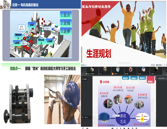 《工业机器人操作与维护》课程以“电机底座的搬运”任务为例,展示了技术与安全、细节、目标管理等元素的巧妙融合;《机电设备维修与维护》以“齿轮箱内齿轮部件的装配”任务为例,植入浙江工匠——“微米”级齿轮装配大师的视频素材,展示“工匠精神、劳动教育”元素;《就业与创新创业指导》一课,教师变身为梦想讲解员,带我们步入“梦想展厅”,看到了学生们为自己人生规划的七彩梦想;《工业机器人操作与维护》以课堂设计、课堂魅力、考核评价、思政融入4个环节,向我们展示了“课堂革命”的课程建设和改革思路。