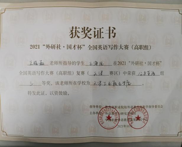赛前,基础部韩亚娟、王晓磊两位老师分别对代表学院参赛的大数据20-5班的薛颖同学和会计20-9班的王海凤同学进行培训和指导,两位教师梳理总结大赛历年的试题,选取不同的主题进行专项练习,从写作内容和写作技巧上有针对性的开展练习指导。两位同学虚心求教,反复进行写作练习,熟记单词,掌握写作技巧。赛场上,两位选手凭借扎实的英语语言基本功,严密的逻辑思维能力,最终获得优异成绩,其中,薛颖同学以位列第一名的成绩获得了天津赛区特等奖,并代表天津赛区晋级全国总决赛;王海凤同学获得了天津赛区三等奖。