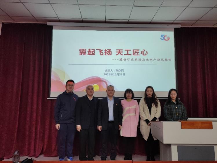 2021年10月31日下午,工信系结合党史学习教育深入开展“我为群众办实事”活动,提升现代通信技术专业新生对专业的认知,特别邀请天津电信北辰分公司党支部书记、总经理,天津市劳动模范张永亮同志来校为新同学做“翼起飞扬 天工匠心”的主题讲座,以行业专家的视角,对通信技术的演进及未来产业化发展趋势进行精彩的解读,为新同学们指明今后学习、工作的方向。