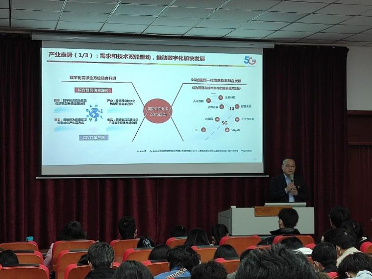 系主任张涛老师在开场中,用数据列举了通信技术给生活、给社会带来的翻天覆地的变化,说明了开设现代通信技术的缘由,明确了以“5G+工业互联网”作为专业发展的方向。