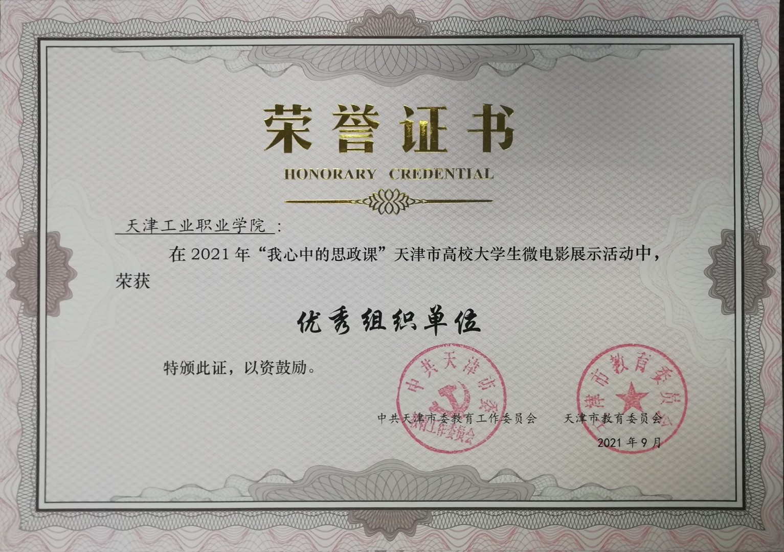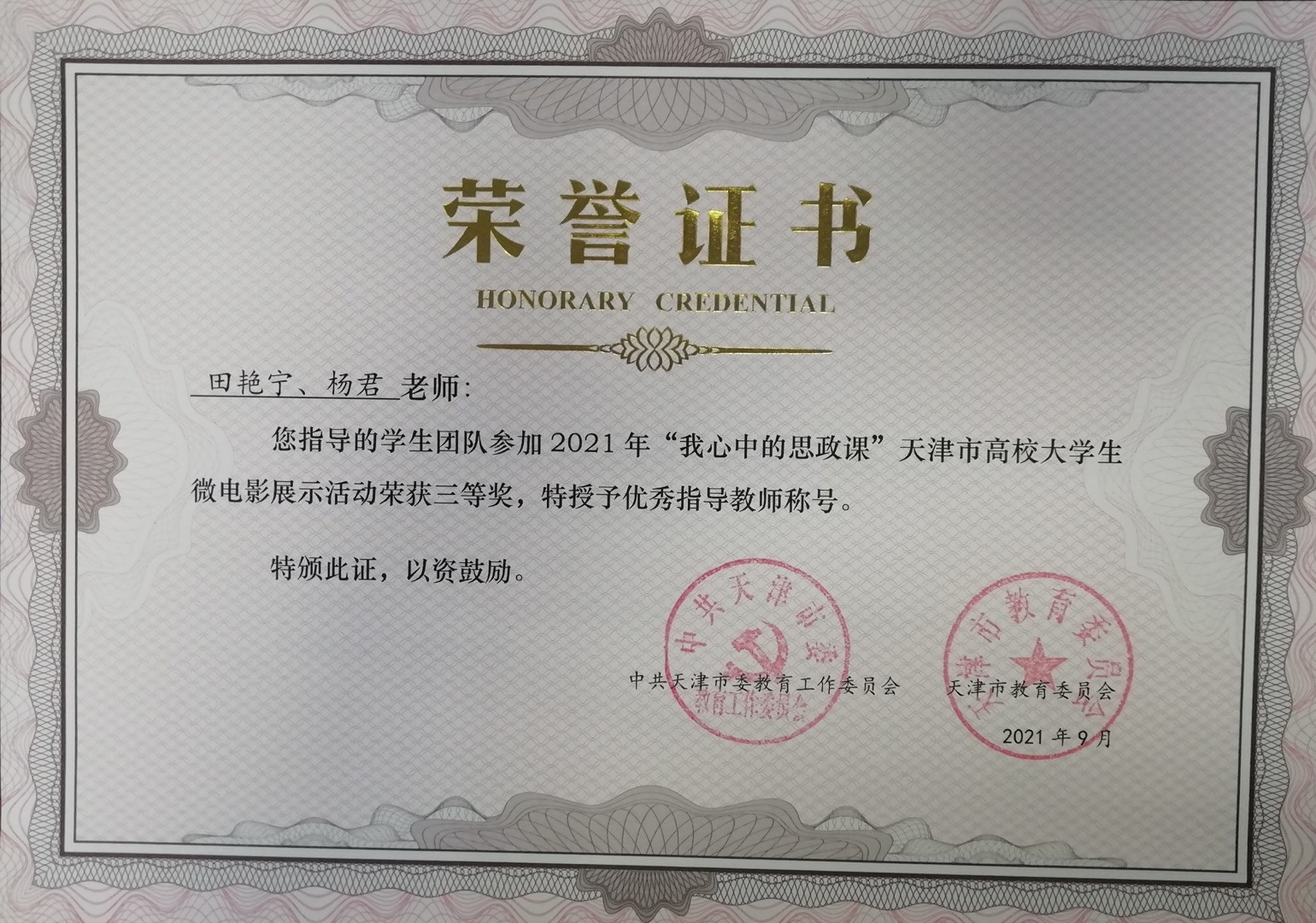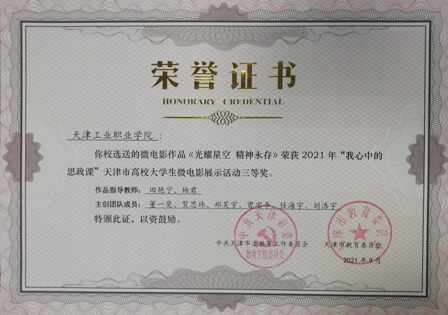 我院思政课部田艳宁、杨君老师指导的学生作品荣获“我心中的思政课”天津市高校大学生微电影展示活动三等奖。两位老师被授予优秀指导教师称号,学院荣获优秀组织单位奖。据悉,该微电影作品同时被天津市推荐参评全国高校大学生微电影展示大赛。