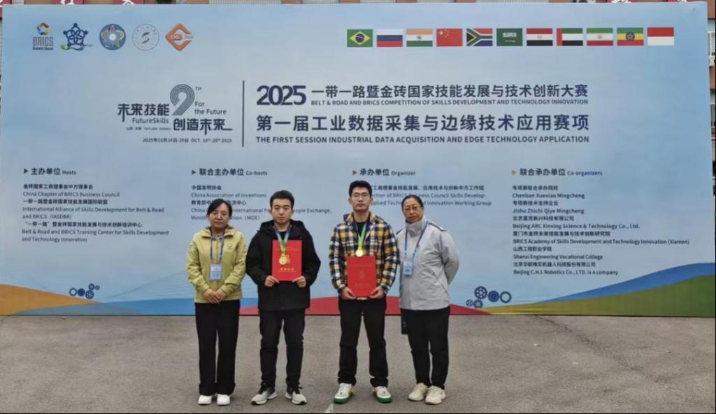 金秋十月,捷报频传。在刚刚落幕的2025一带一路暨金砖国家技能发展与技术创新大赛第一届工业数据采集与边缘技术应用赛项中,taptap点点体育工业与信息化系教师付晓艳、唐继英带领工业互联网专业学生陈海峰及电气专业学生李旺普组成的参赛团队,凭借扎实的技术功底、默契的团队协作与稳定的临场发挥,从来自全国的100余支参赛队伍中脱颖而出,一举摘得一等奖桂冠,为学院再添殊荣。