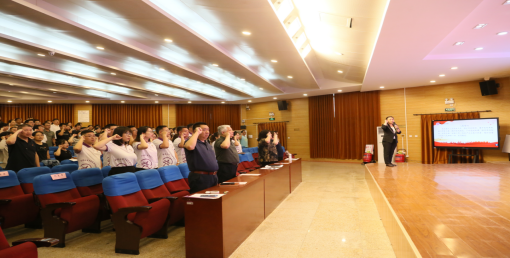 党委书记汪坪带领全体党员面向党旗庄严宣誓,党员们铿锵有力的誓言响彻会场,表达了身为共产党员的责任与担当。这些坚定的誓言不仅彰显了党员同志们对中国共产党的忠诚,更展现了他们入党的初心和使命。