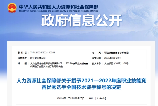 近日,人力资源和社会保障部发布《关于授予2021—2022年度职业技能竞赛优秀选手全国技术能手称号的决定》。“全国技术能手”荣誉称号每两年评选一次,是面向技能人才最高的政府奖项之一,受到表彰的高技能人才均是全国技能人才中的杰出代表。