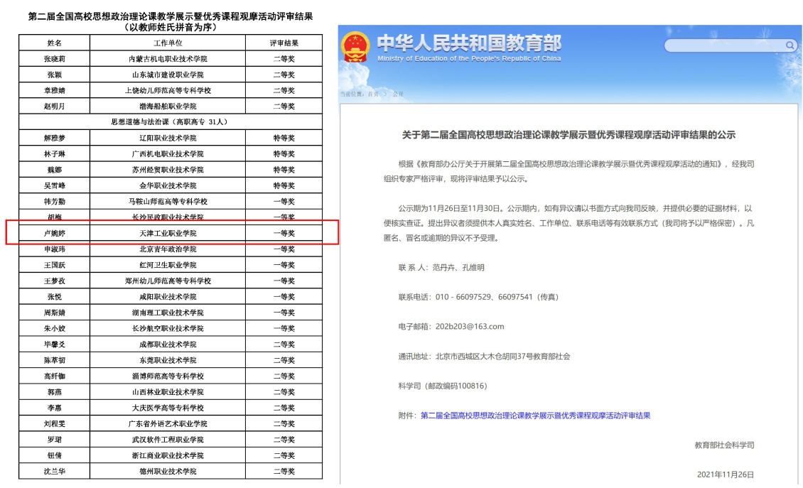 2021年11月26日,教育部“第二届全国高校思想政治理论课教学展示暨优秀课程观摩活动”结果揭晓,我院思政课部卢婉婷老师荣获一等奖。这是我院近年来思政教学竞赛方面所取得的最好成绩,展现了我院多年来不断加强思想政治教育工作的显著成效。