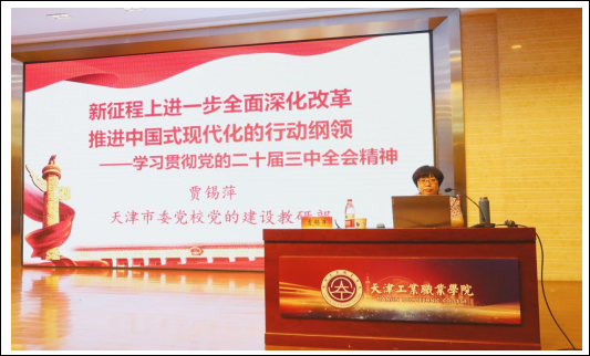 为深入学习宣传贯彻党的二十届三中全会精神,深刻领会习近平总书记关于全面深化改革的一系列新思想、新观点、新论断,让党的创新理论深入人心,9月13日,学院党委邀请中共天津市委党校党的建设教研部主任贾锡萍教授到校做《新征程进一步全面深化改革推进中国式现代化的行动纲领——党的二十届三中全会精神解读》专题讲座,全体党员干部、民主党派、无党派人士参加学习。