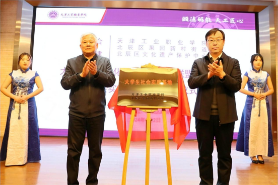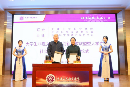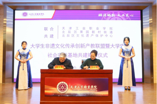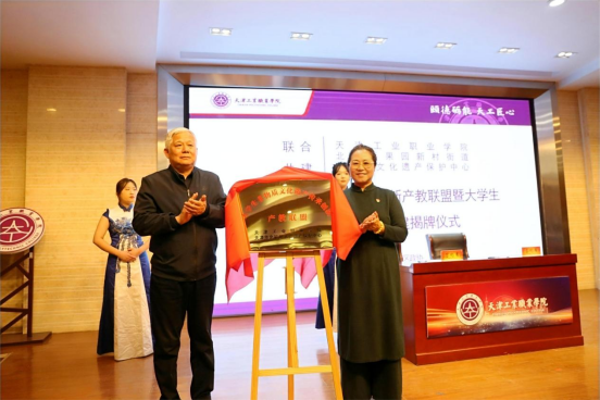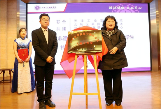 学院院长孔维军与北辰区文化遗产保护中心主任曹广凤,共同签订“大学生非遗文化传承创新产教联盟”共建协议并为“联盟”揭牌。